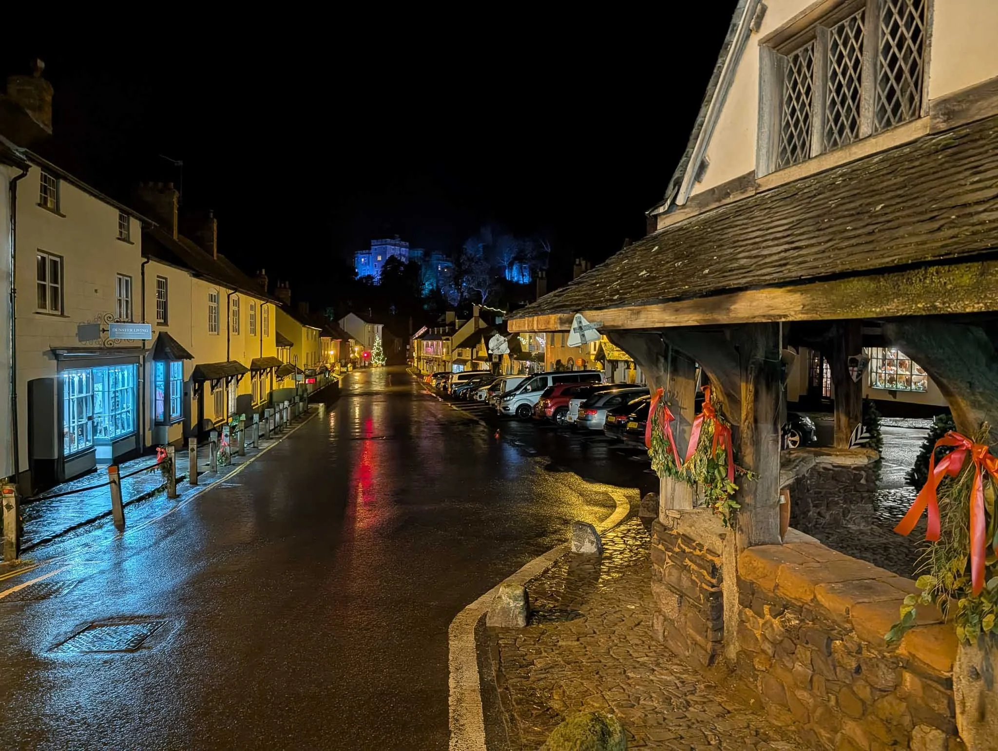Dunster main street on a night before Christmas