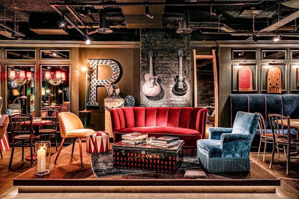 Which is why there’s a carnival theme running throughout this comparatively small hotel. According to the Ruby Hotel team “Rich, dark tones meet bright brass accents and subtle stripes are accented with playful props including circus drums and juggling pins.”