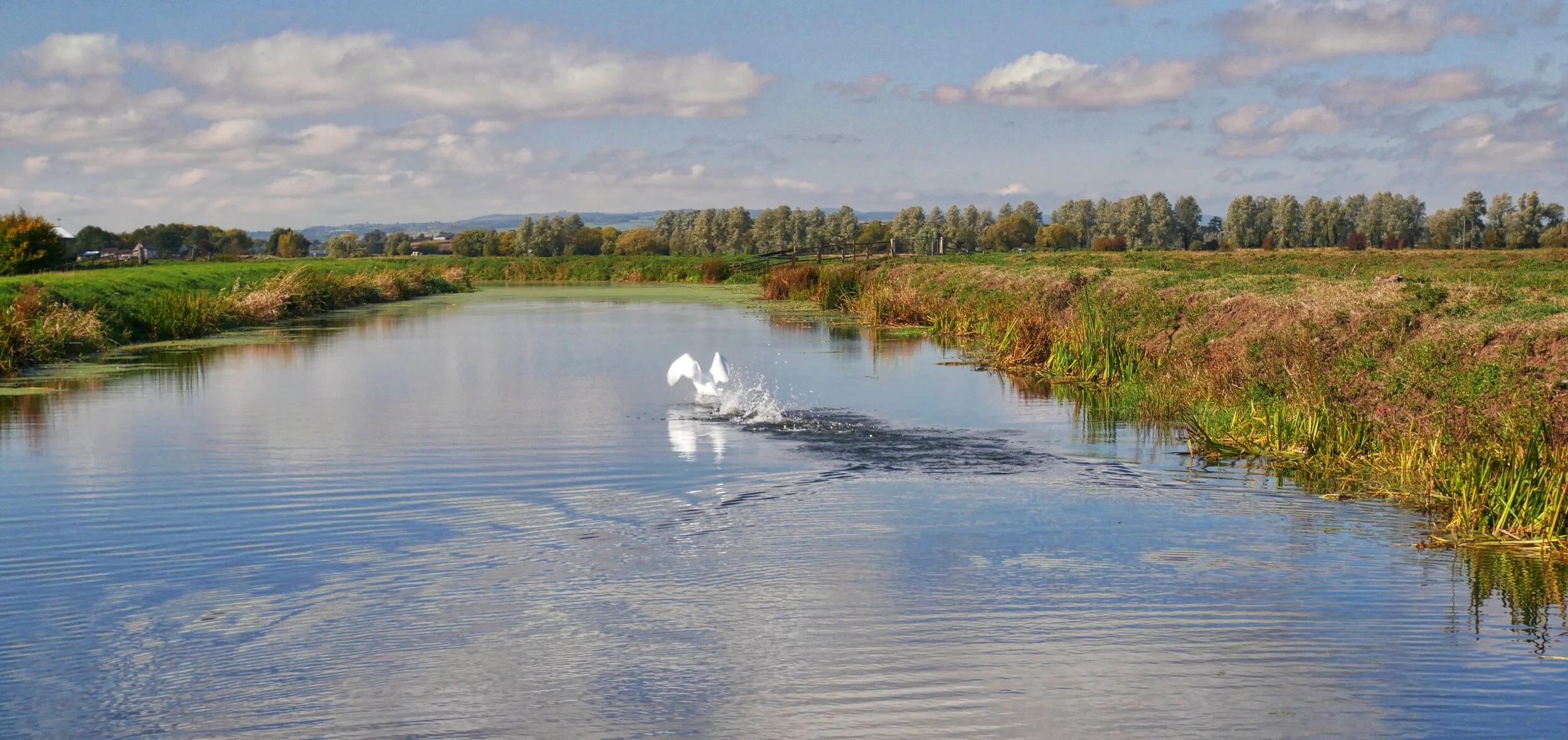 Swan takes off on the River Parrett in the heart of the Somerset Levels