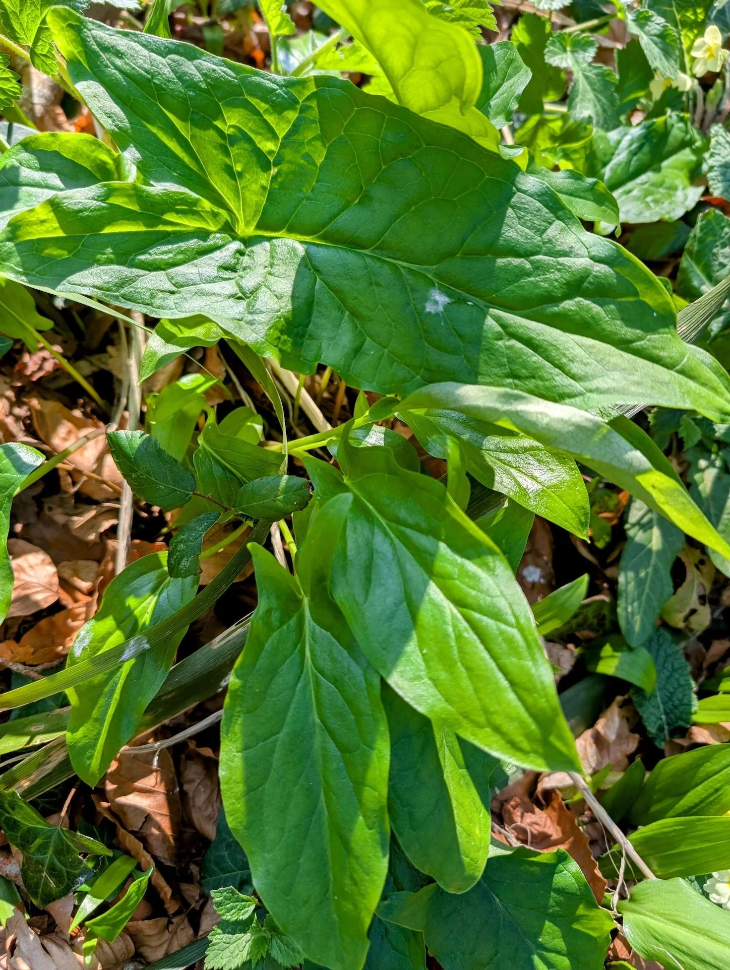 I didn’t have to go far to snap a photo of the potential dangers. At this time of year, wild garlic grows at more or less the same time as cuckoo-pint (or lords and ladies, or Arum maculatum, to give the proper name). This strange plant, which will eventually grow a spike of bright red berries, is toxic and you do not want to be eating it. Yet the leaves, although a different shape, are almost identical in colour to wild garlic and the two often grow side by side. I took this photo in my own garden – indeed, I see them growing together in all my favourite wild garlic spots. So be warned.