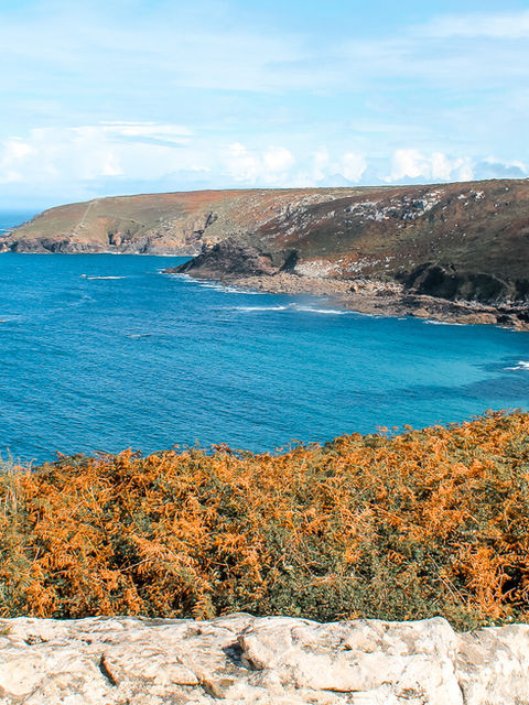 You reach the headland by heading straight on where the lane meets the coast path. Turn left along instead and you could, if you wished, enjoy an entirely different circular walk back to the village via Carnelloe Cliff, turning inland up the valley called Poniou, and returning over the hill through the small fields.