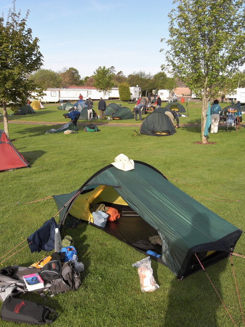 It was only £4 a night to camp at North Water Bridge, but it did have the disadvantage of being very near a main road, which made it a bit noisy. There were quite a few tents already pitched, but by nightfall the place was packed. All Challengers except for a few caravaners peeping out from behind curtained windows to watch this strange influx. I was strangely tired and was falling asleep over dinner, so went to bed early.