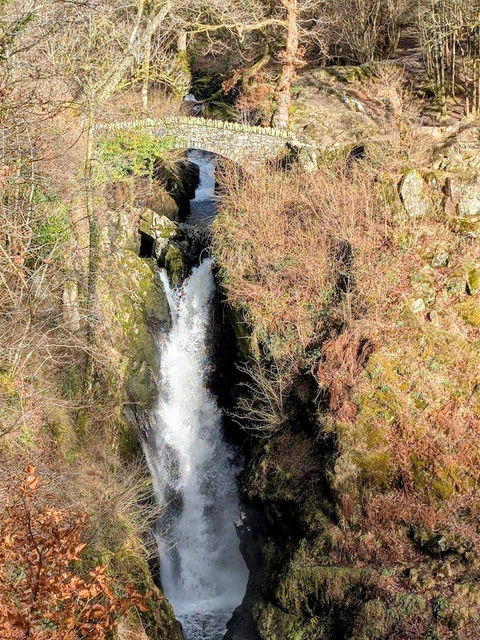 For here you will find the much-loved Aira-Force waterfall - a cataract which the Trust has made more accessible with well-laid pathways that run up one side of the falls and descend down the other. You can choose how far up you go, thanks to the fact a couple of foot bridges offer the chance to shorten the climb, allowing you to cross the cataract and return to the visitor centre and cafe, should you urgently feel in need of hot tea, ginger-bread or whatever. Needless to say, we went to the top, because this really is a superb little walk.